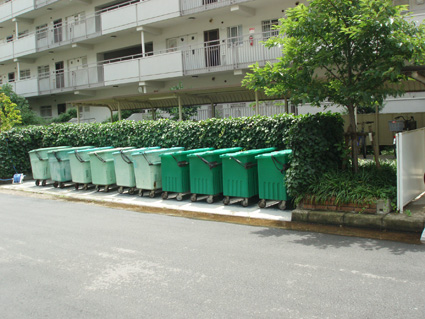 汚れやすく見苦しくなりがちなごみコンテナ置き場は、床防水を施し、フェンスとツル性の植栽で囲い、週2回のごみ回収の際にきっちり清掃しています