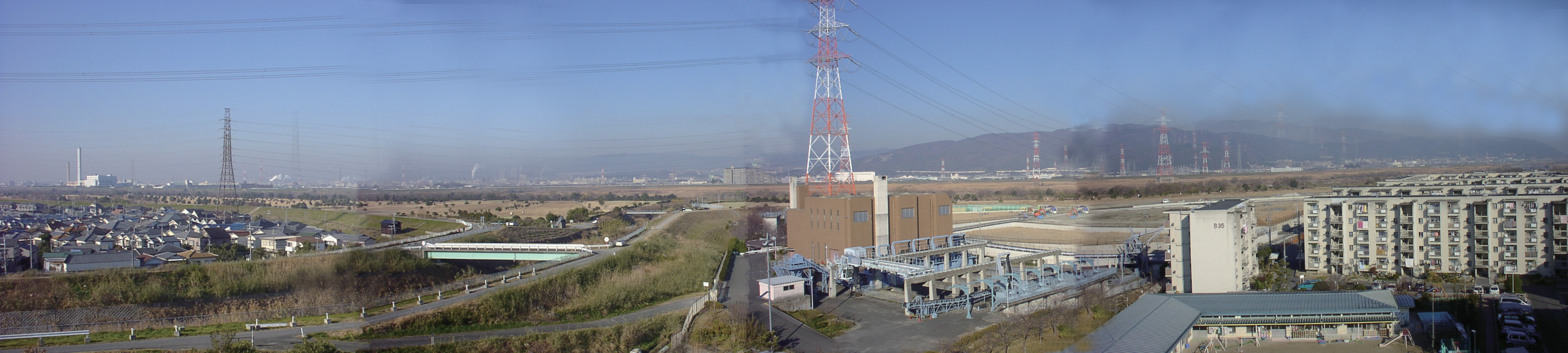 遠くに見える山影は天王山、山崎あたり。左側の河は穂谷川、穂谷川が150mくらい先で淀川に合流している。